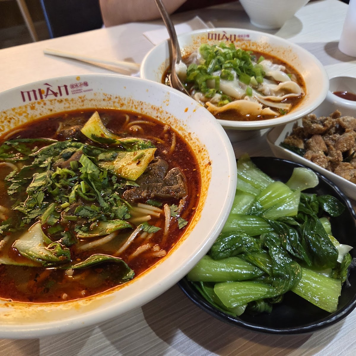 Stumbled into Mian and was not disappointed. Ordered the pork dumplings, clear broth beef noodles, and the house beef noodles. The clear broth beef noodles are great for those looking for something without spice. The house beef noodles were the best of the three dishes and weren't overly spicy. The dumplings were also very good. Overall, the atmosphere was nice and we had good service. If you like noodles and dumplings, you will likely find something on the menu that hits the spot. P.S. Chopsticks, no forks... As I would expect from an authentic noodles and dumplings house.